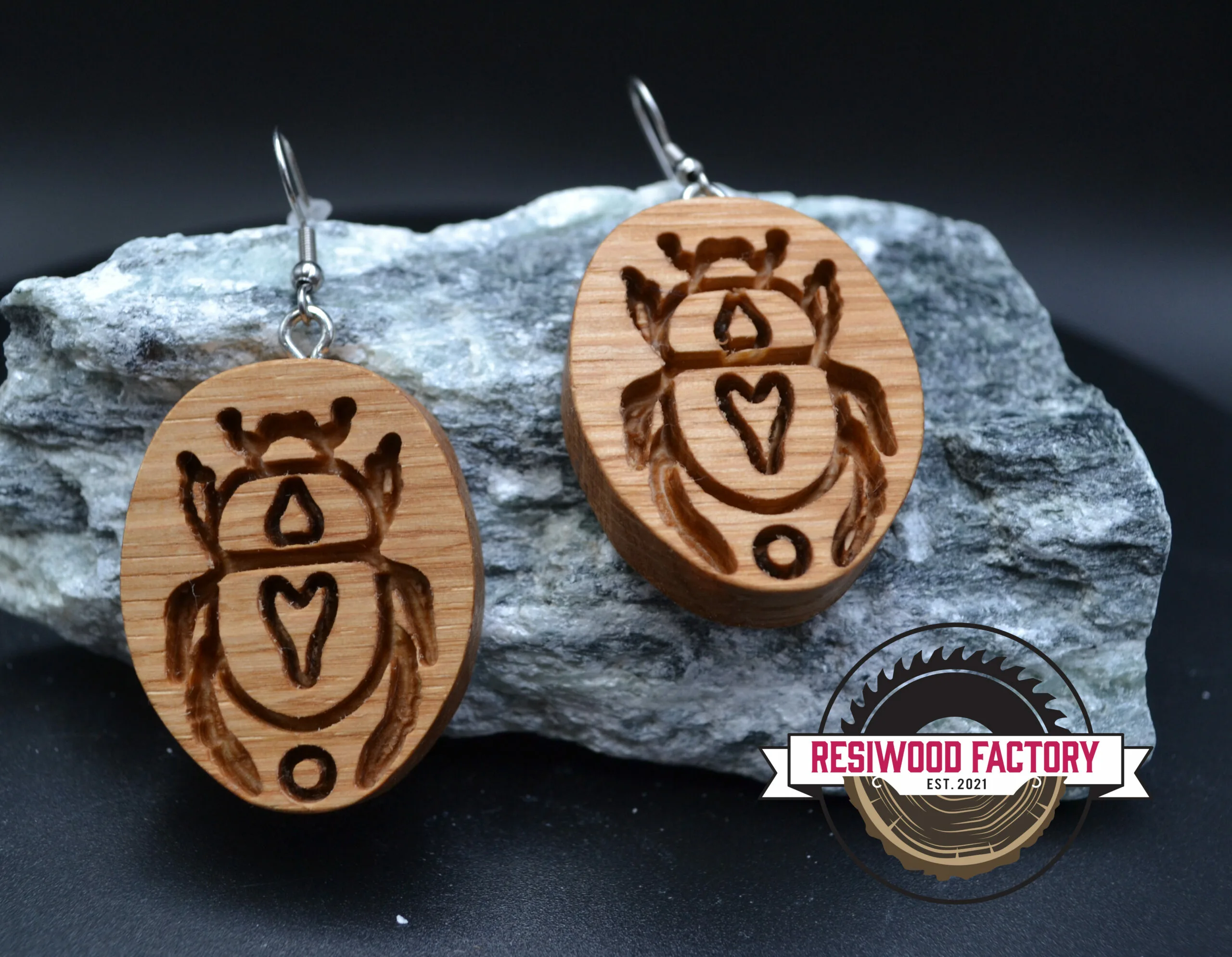 Ces boucles d’oreilles « Scarabée » sont donc réalisées dans du Chêne de 8mm d’épaisseur, puis poncée à la main avant de recevoir un traitement à base d’huile de Lin.